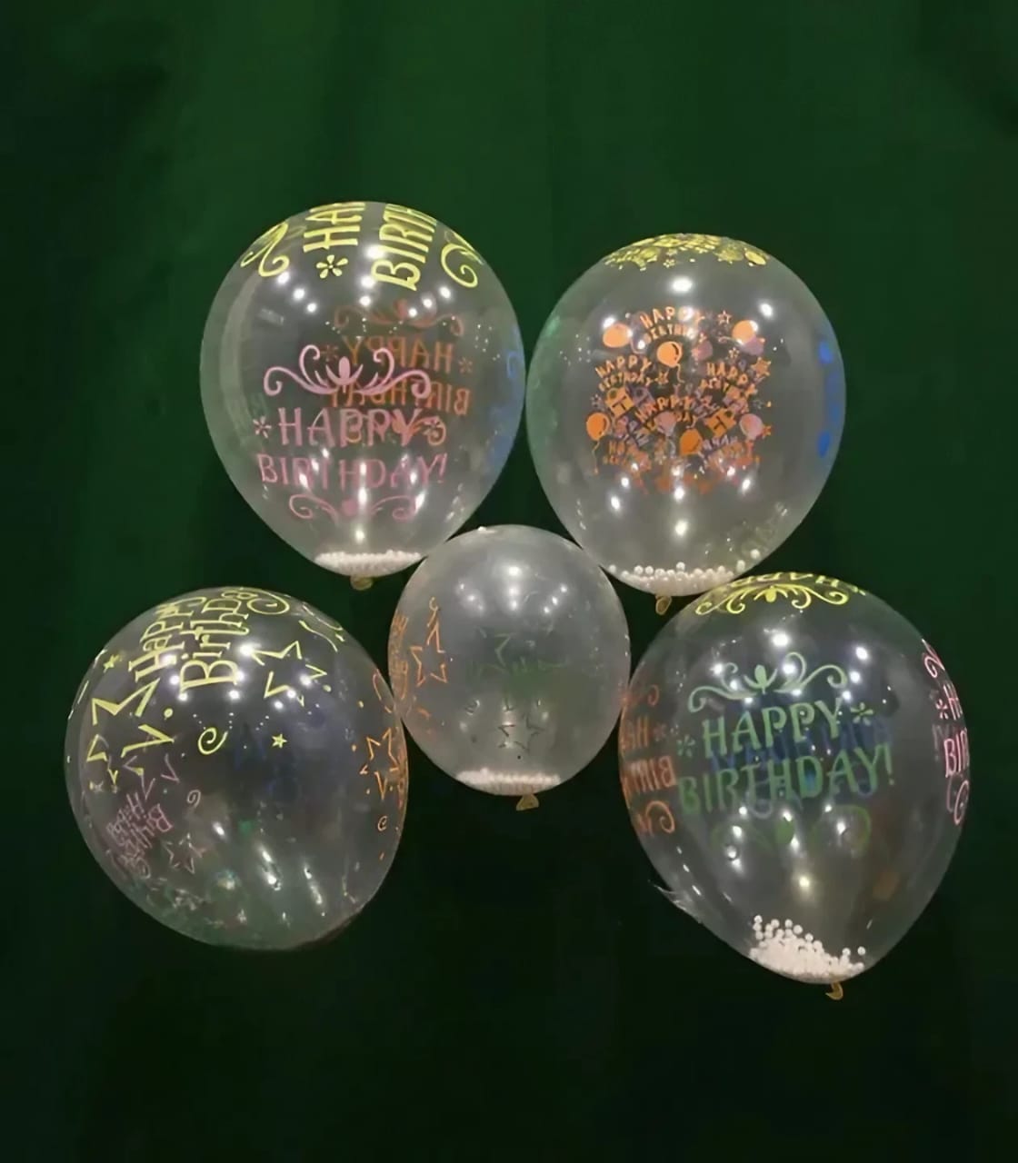 • Transparent latex balloons with colorful “Happy Birthday” prints