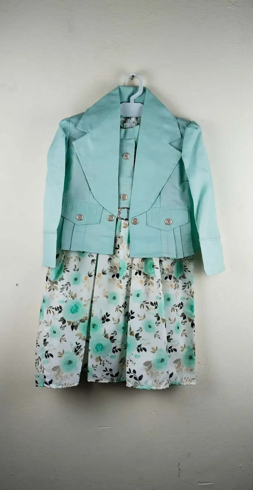 The skirt is white with a lovely floral print in mint green, beige, and black, creating a gentle and classy contrast. Its lightweight fabric makes it comfortable for children to wear throughout the day. The combination of the jacket and printed skirt gives the outfit a polished appearance while still feeling soft and child-friendly