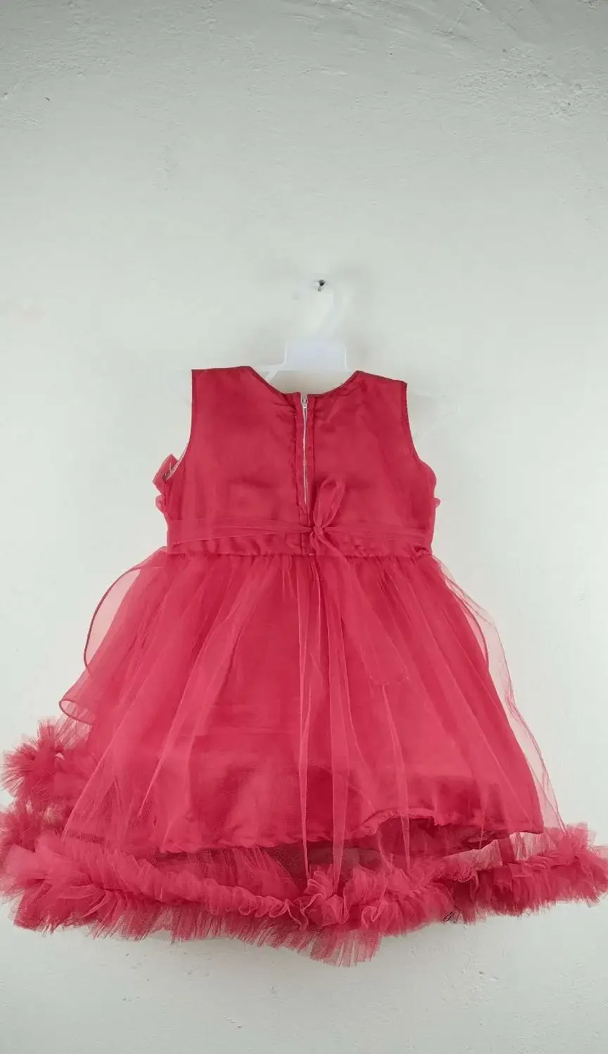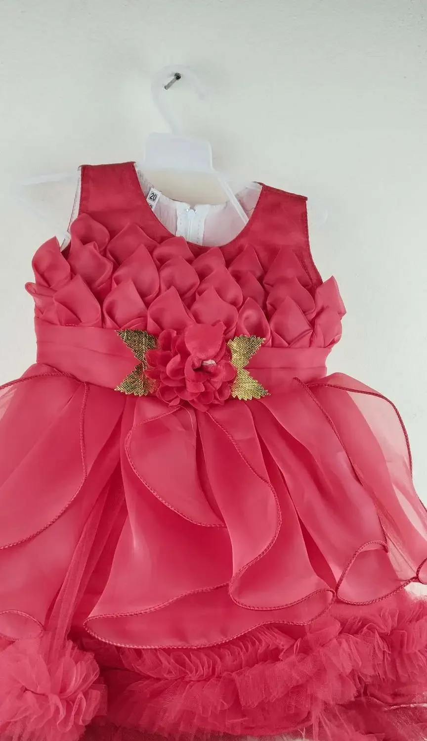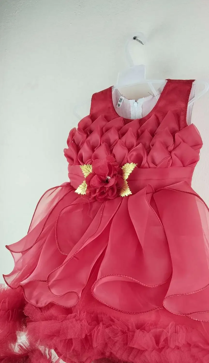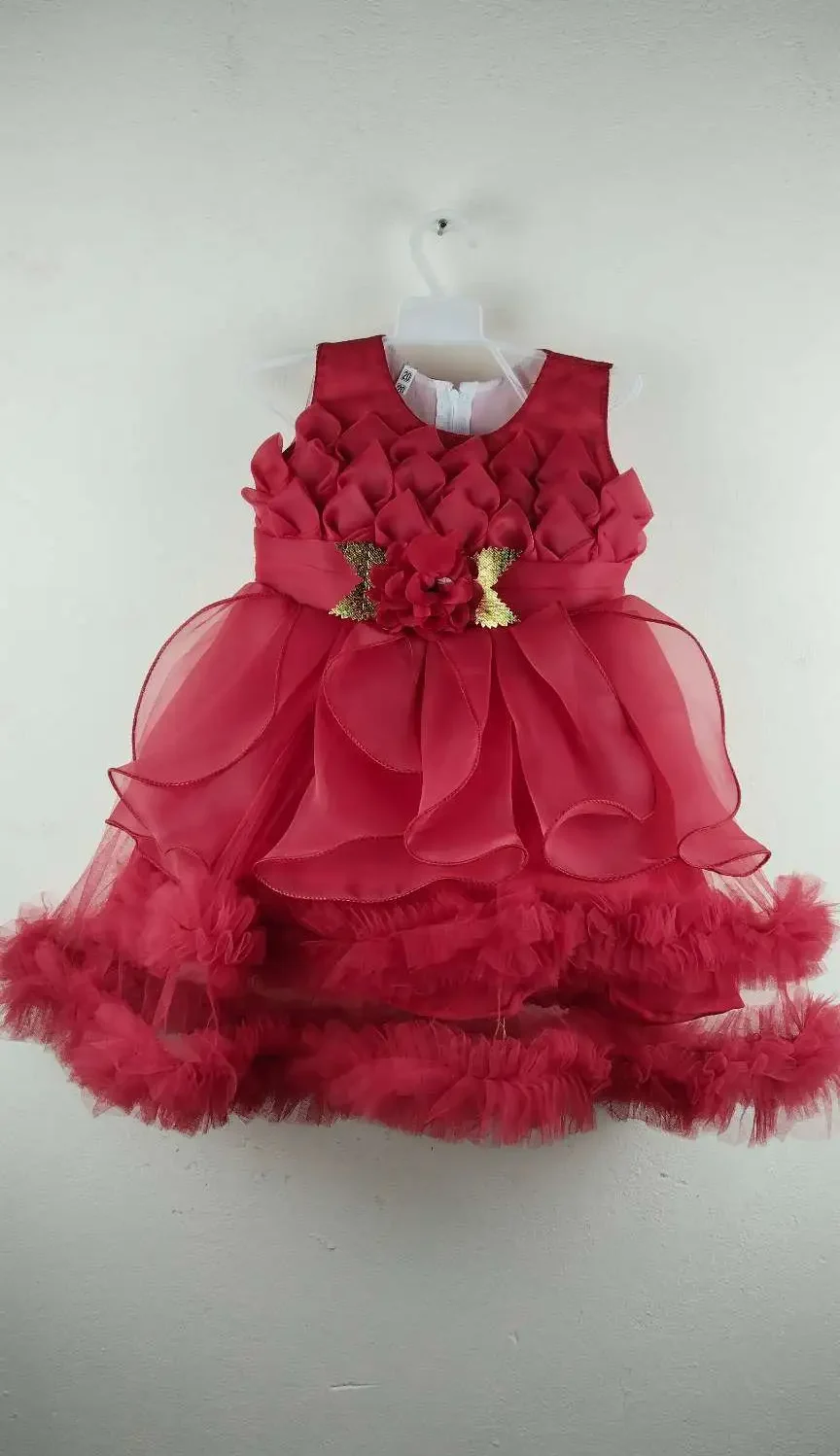 This Red Party Frock for Girls is designed to make your child look cute and elegant. The soft fabric feels comfortable on the skin and is easy to wear. The top has beautiful flower details that add a charming look to the dress.