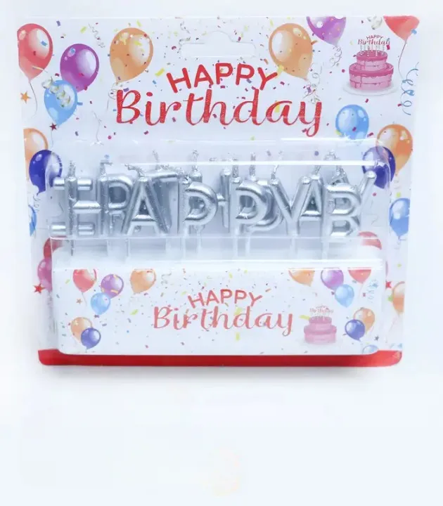 Silver Letter Party CandleCelebrate birthdays in style with these silver letter party candles! Designed to spell out “Happy Birthday,” this pack includes shiny silver candles that add sparkle and fun to any cake. The festive packaging features colorful balloons, confetti, and cheerful birthday graphics, making it ideal for parties of all ages.